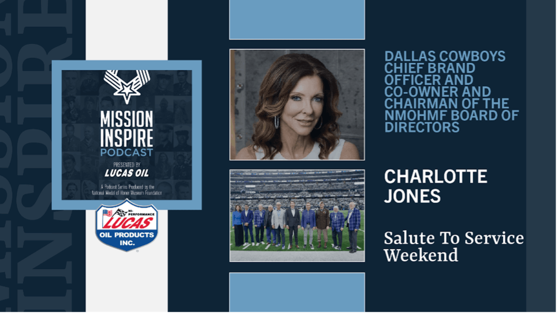 Over Veterans Day Weekend, the National Medal of Honor Museum Foundation once again proudly partnered with the Dallas Cowboys to publicly recognize and thank Medal of Honor recipients during the Cowboys’ annual Salute to Service game. Charlotte Jones, Dallas Cowboys Chief Brand Officer and Co-owner and Chairman of the NMOHMF Board of Directors, talked to host Mo Barrett about the importance of that moment, the Cowboys’ support of the Museum, and what to look forward to during the Grand Opening celebration in March.t